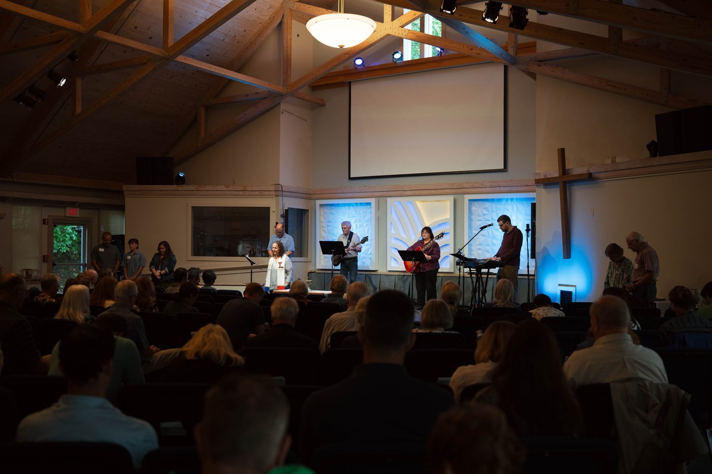 Our Sunday service runs for about 70 minutes. We start with contemporary worship led by our band - song lyrics are displayed on screens so you can follow along and engage in whatever way feels comfortable. After worship, you'll hear an encouraging message centered on Jesus and practical faith. We celebrate communion together on the first and third Sundays of each month, with children joining us on the third Sunday.
